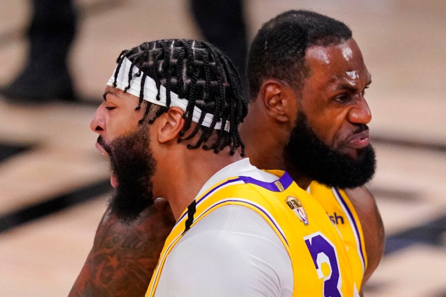 Los Angeles Lakers' Anthony Davis (3) bumps shoulders with LeBron James while celebrating after a dunk against the Miami Heat during the second half of Game 1 of basketball's NBA Finals Wednesday, Sept. 30, 2020, in Lake Buena Vista, Fla. (AP Photo/Mark J. Terrill)