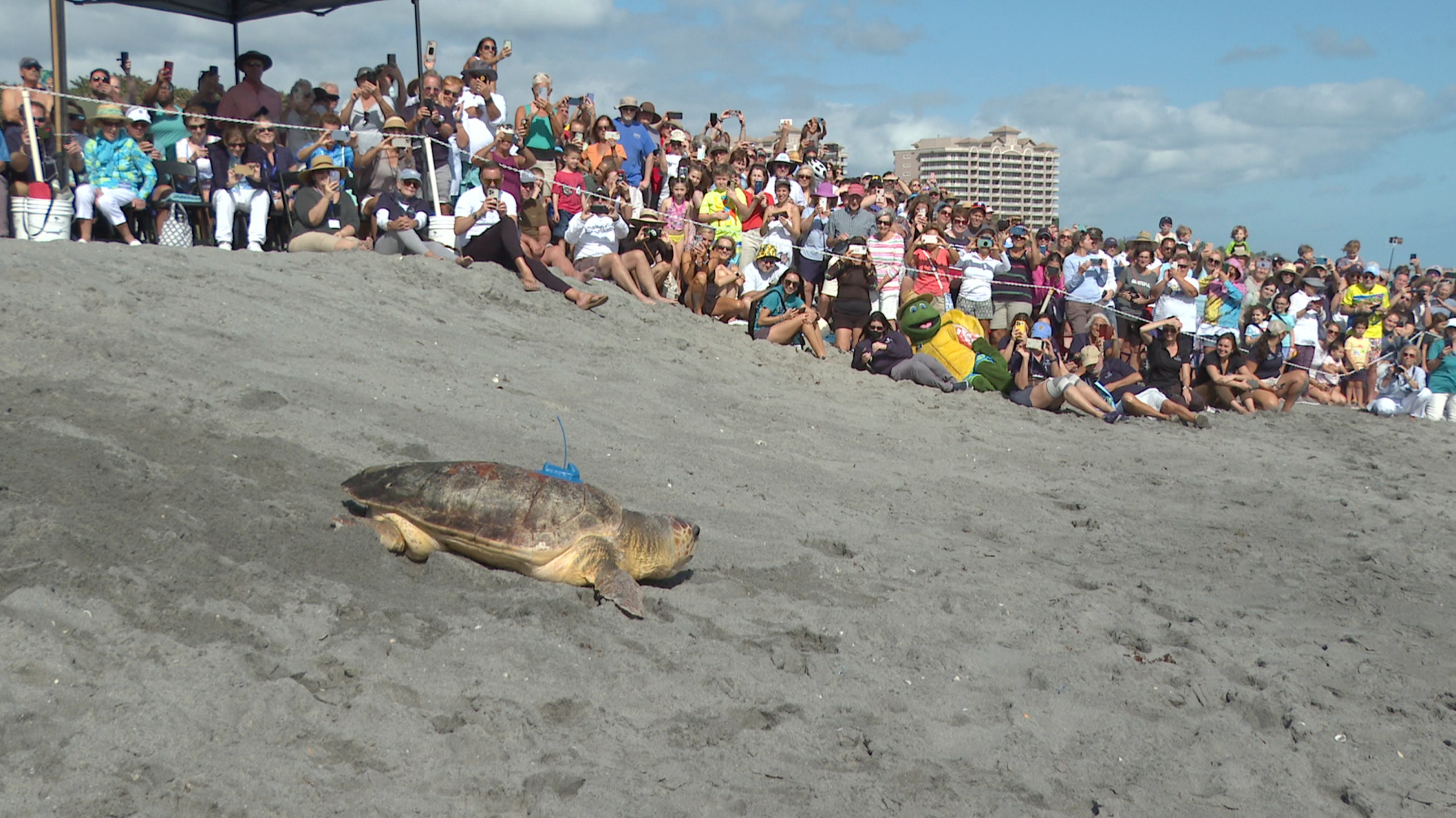 Turtle hospital staff and volunteers cheered as the turtle made its way down the beach, which is directly across the street from the center. Rocky was equipped with a blue tracking device on its back, which allows the staff to continue monitoring the large turtle.