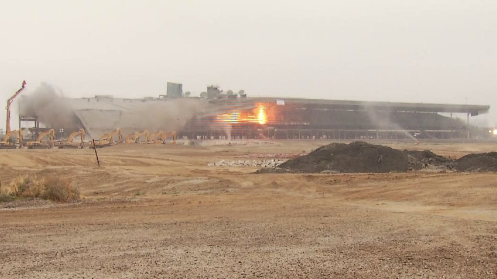 Demolition Crew Uses Explosives to Bring Down Grandstand …
