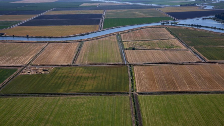 An irrigation canal runs through a patchwork of farmland near the confluence of the Sacramento and San Joaquin Rivers as viewed from the air on May 22, 2023, near Lodi, California. (Photo by George Rose/Getty Images)