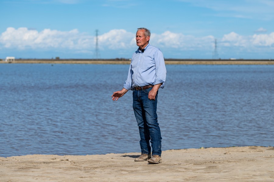 In this photo provided by the California Department of Water Resources, Don Cameron, general manager of Terranova Ranch, poses as recharge water stands in this fallow field at Terranova as part of a groundwater recharge system designed to divert floodwater from the Kings River in Fresno County, on March 13, 2023.