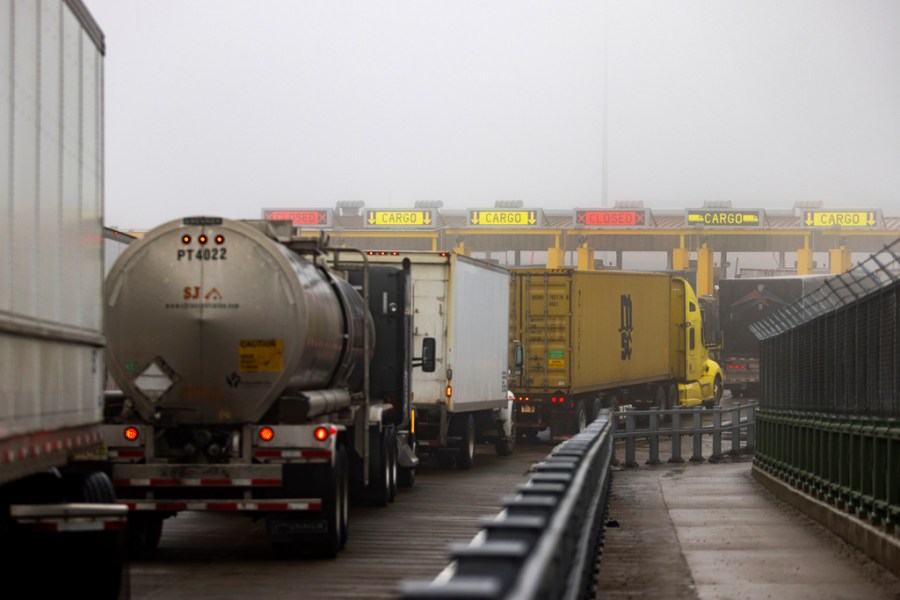 FILE - Trucks wait to cross the United States border on the Peace Bridge, Thursday, Feb. 27, 2025. (AP Photo/Lauren Petracca)