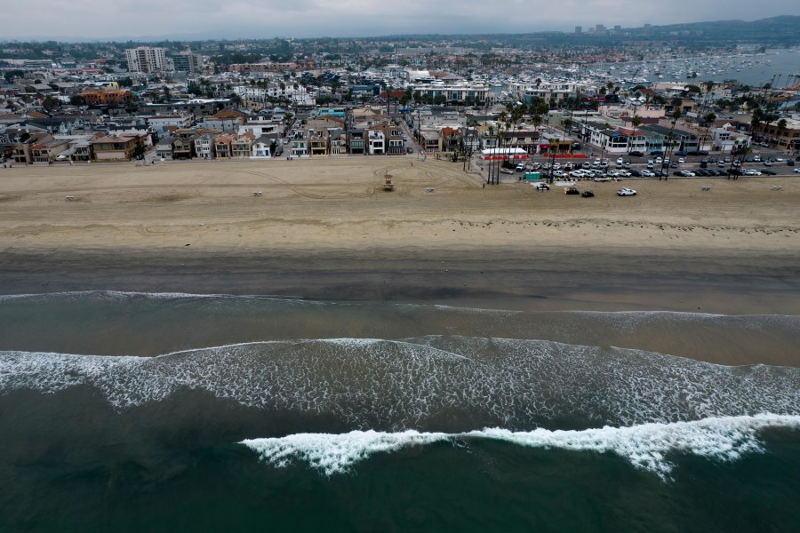 FILE - This aerial image taken with a drone, shows the closed beach after oil washed up in Newport Beach, Calif., on Oct. 7, 2021. Shipping companies have agreed to pay nearly $97 million to settle a lawsuit with a pipeline operator over a 2021 oil spill off the coast of Southern California. Amplify Energy, the Houston-based company that operates the pipeline, said Wednesday, March 1, 2023, that companies associated with the M/V Danit and M/V Beijing had agreed to the payments. (AP Photo/Ringo H.W. Chiu, File)