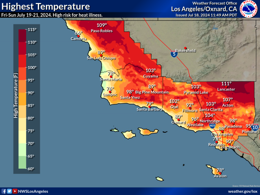 Southern California valleys, mountains and deserts will experience the highest extremes with temperatures in the triple digits in the lower mountains and interior and between 95 and 105 in coastal valleys, according to the National Weather Service.